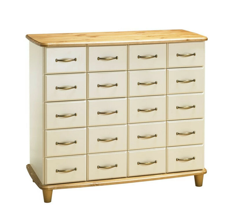 Aino apteekkarin lipastossa on 20 pientä laatikkoa metallisilla kiskoilla varustettuna.