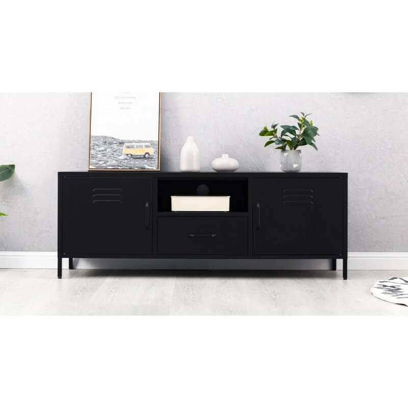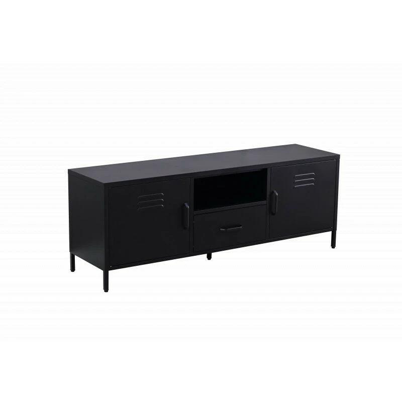 Tyylikäs metallinen Carbon tv-taso kahdella kaapilla, vetolaatikolla sekä avotasolla. Vetolaatikossa on metalliset liukukiskot.