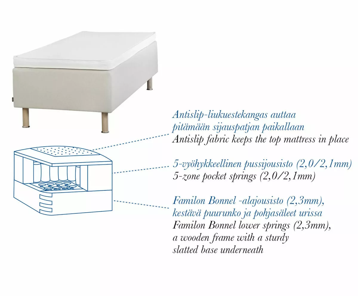 Oikeanlaisen tuen antavassa Familon Zone-vuoteessa selkäranka on luonnollisen suorassa asennossa ja vartalo saa hyvän tuen, näin koko keho rentoutuu ja uni on levollista. Vartaloa tukevan ja myötäilevän Familon Zone joustinsängyn rakenteessa yhdistyvät optimaalisesti myötäilevä 5-vyöhykkeellinen pussijousisto ja entistä tukevampi Bonnel-alajousisto. 5-vyöhykejousisto tukee vartaloa juuri oikeasta kohdasta: keskivartaloa kannattelevasti ja hartiaseudulta myötäilevästi, alajousisto lisää sängyn kestävyyttä ja kannattelevuutta. Vakaan ja kestävän Zone-runkopatjan puurungossa on alla hengittävä ja tukeva sälepohja. Valittavanasi on 3 tyylikästä jalkavaihtoehtoa. 20 cm korkeat jalat ovat altakierrettävät. Kiinnitys on nopeaa eikä työkaluja tarvita.