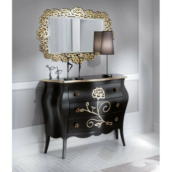 La Casa-tuotesarjan todella tyylikäs lipasto moneen eri käyttöön. Lipastossa on kolme tilavaa vetolaatikkoa ja kauniit koristeelliset metallivetimet. Valmistettu massiivipuusta ja kalustelevystä. Laatikoston etureunassa on kaunis kullanvärinen ruusukuvio.