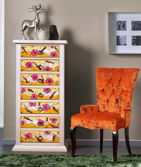 Italialaisen La Casa-tuotesarjan värikäs kapea lipasto kauniilla kuvioiduilla vetolaatikoilla. Kauniissa lipastossa on yhteensä 7 vetolaatikkoa.