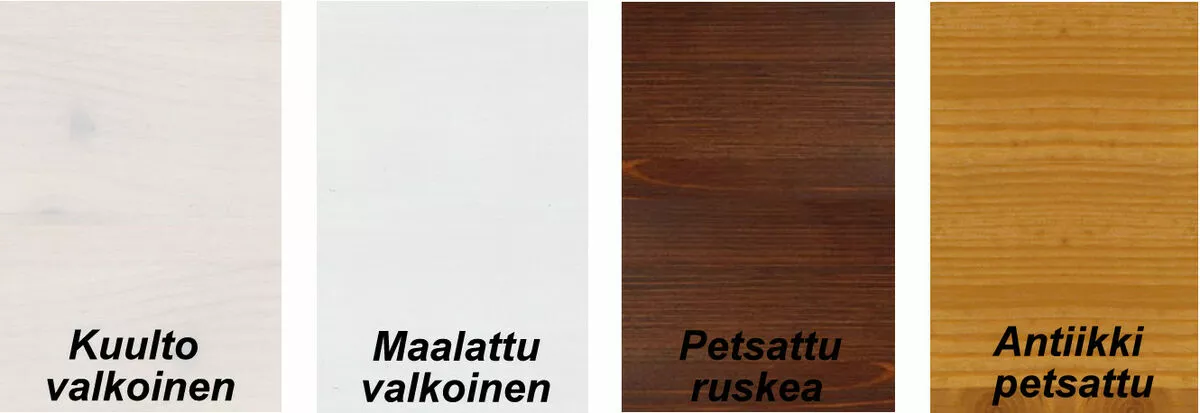 - Petsivärit kuultavia. Puun syyt heijastuvat kauniisti värin alta läpi. Peittävä valkoinen peittää pinnasta n. 95%