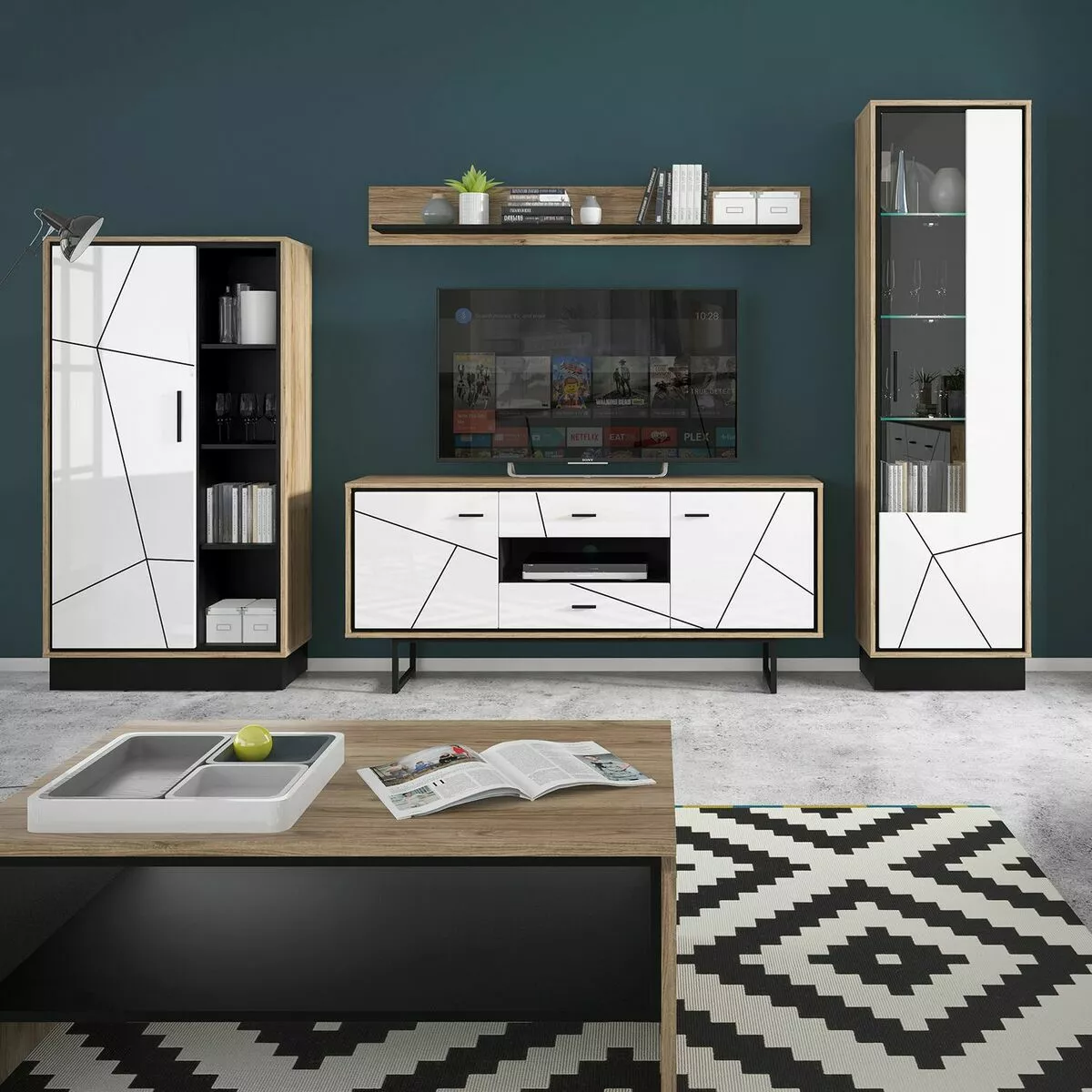 - Tv-tasossa 2 ovikaappia välihyllyillä, 2 vetolaatikkoa sekä avotaso