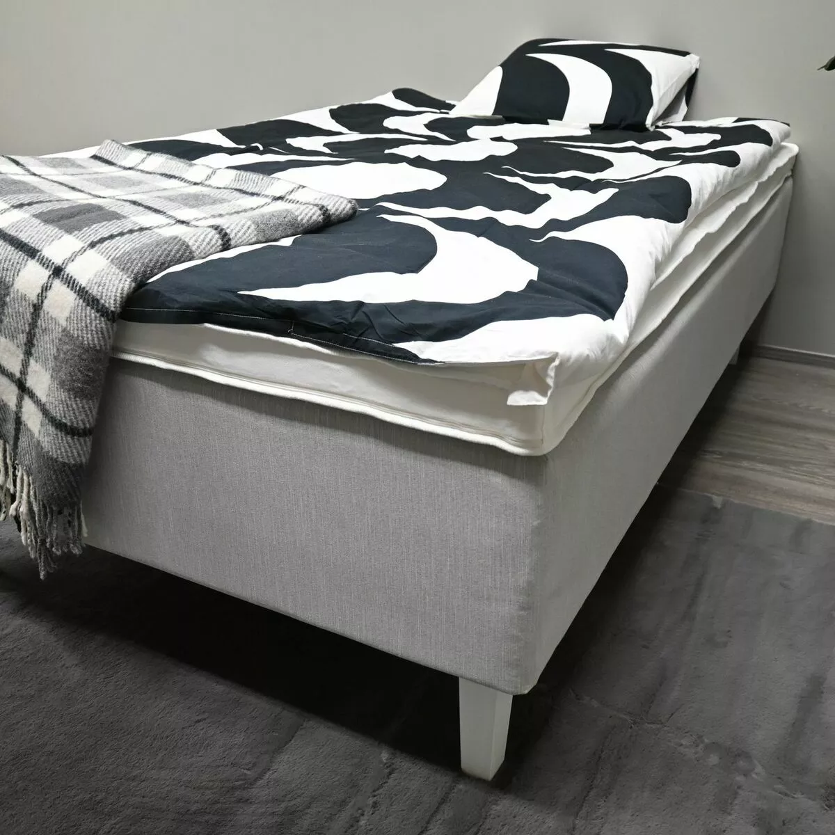 - Sängyn runko verhoiltu vaalean harmaalla Melva-huonekalukankaalla
