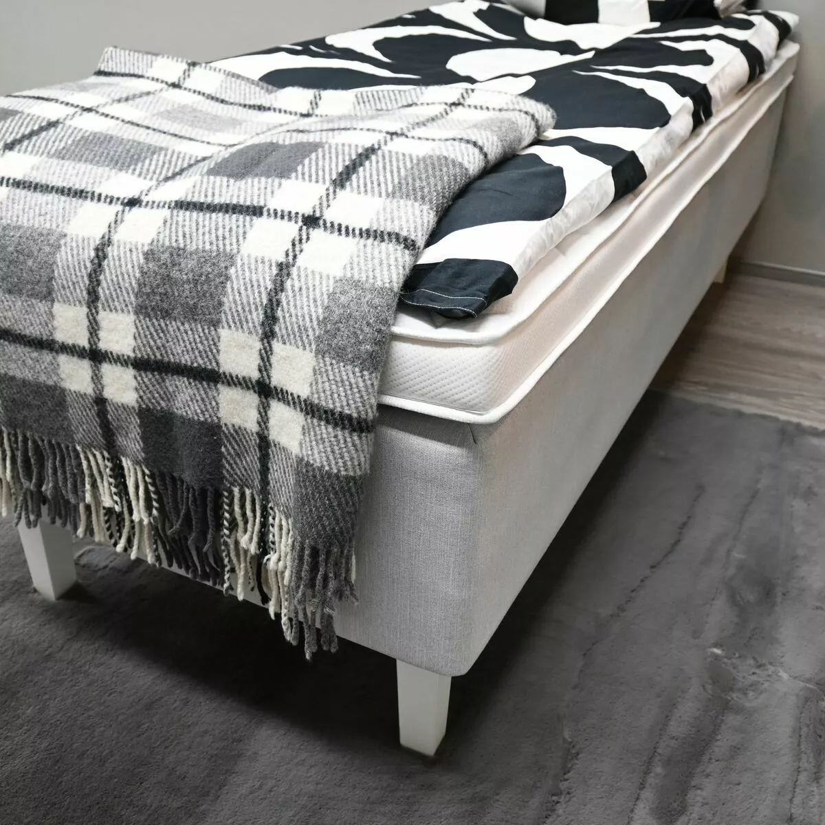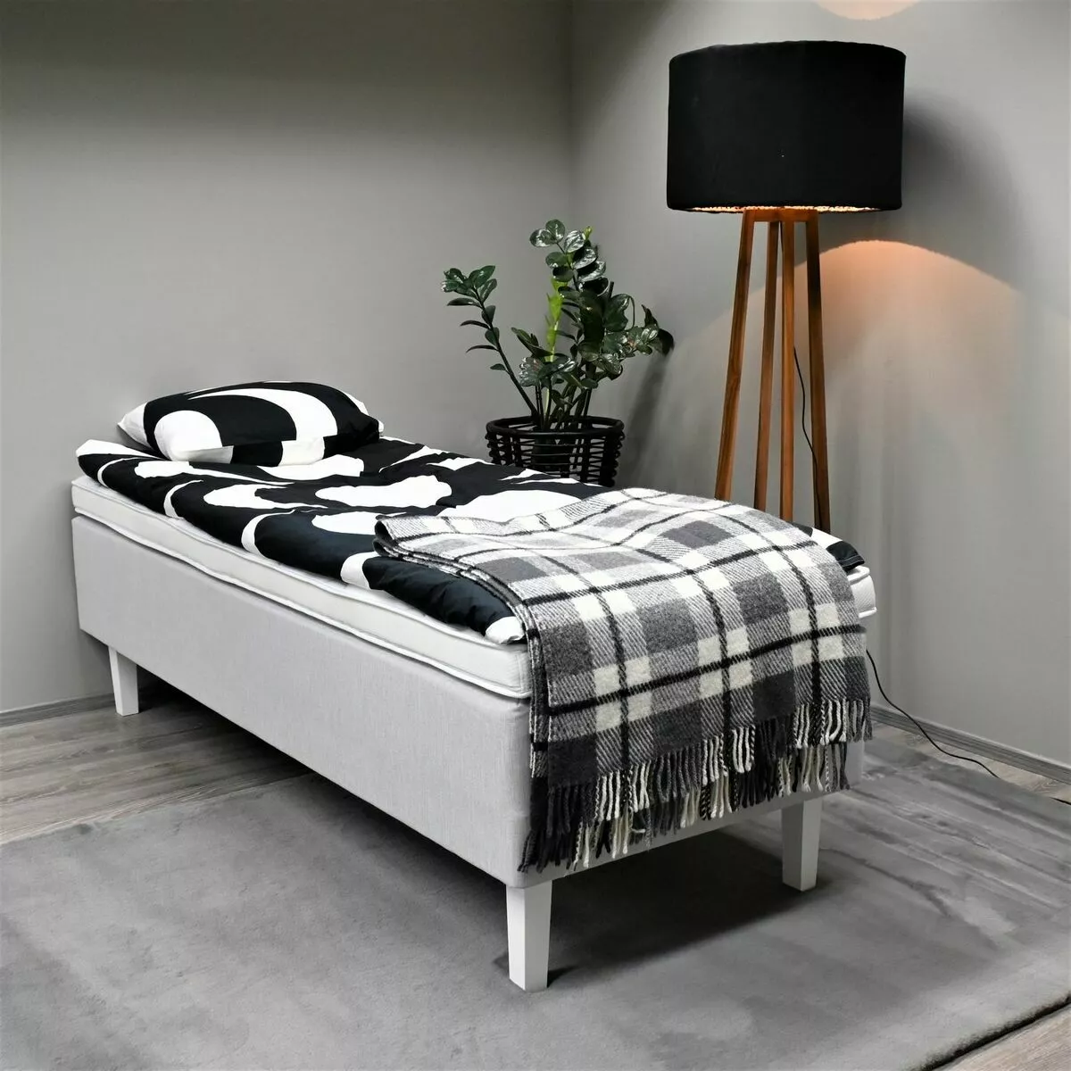 - Sängyn runko verhoiltu vaalean harmaalla Melva-huonekalukankaalla