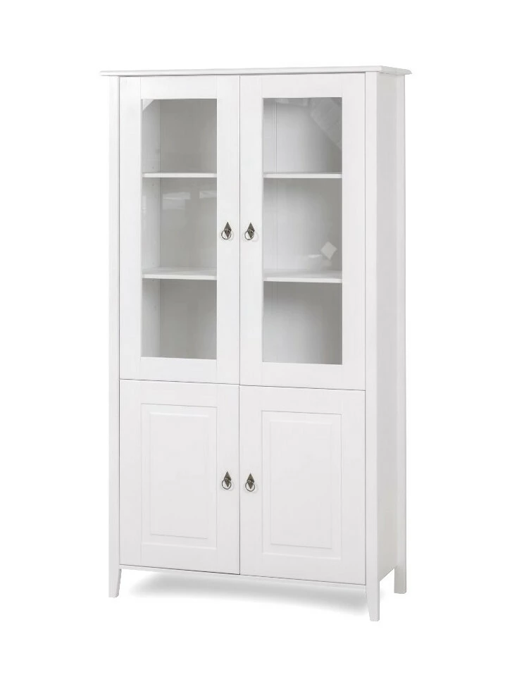 Tyylikkään ajaton vitriinikaappi lasi- ja umpiovilla.